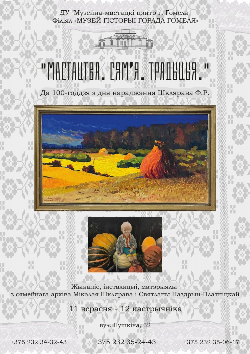 Запрашаем усіх жадаючых наведаць выстаўку "Мастацтва. Сям’я. Традыцыя", прысвечаную 100-годдзю з дня нараджэння Шклярава Ф.Р., што будзе дзейнічаць у Музеі гісторыі горада Гомеля. Жывапіс, інсталяцыі, матэрыялы з сямейнага архіва Мікалая Шклярава і Святланы Наздрын-Платніцкай.