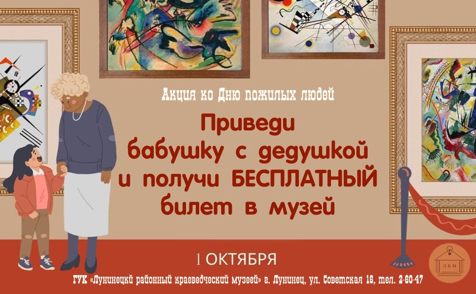 1 октября, в День пожилых людей, ГУК "Лунинецкий районный краеведческий музей" проводит акцию: приведи с собой бабушку с дедушкой и посети музей бесплатно!!!