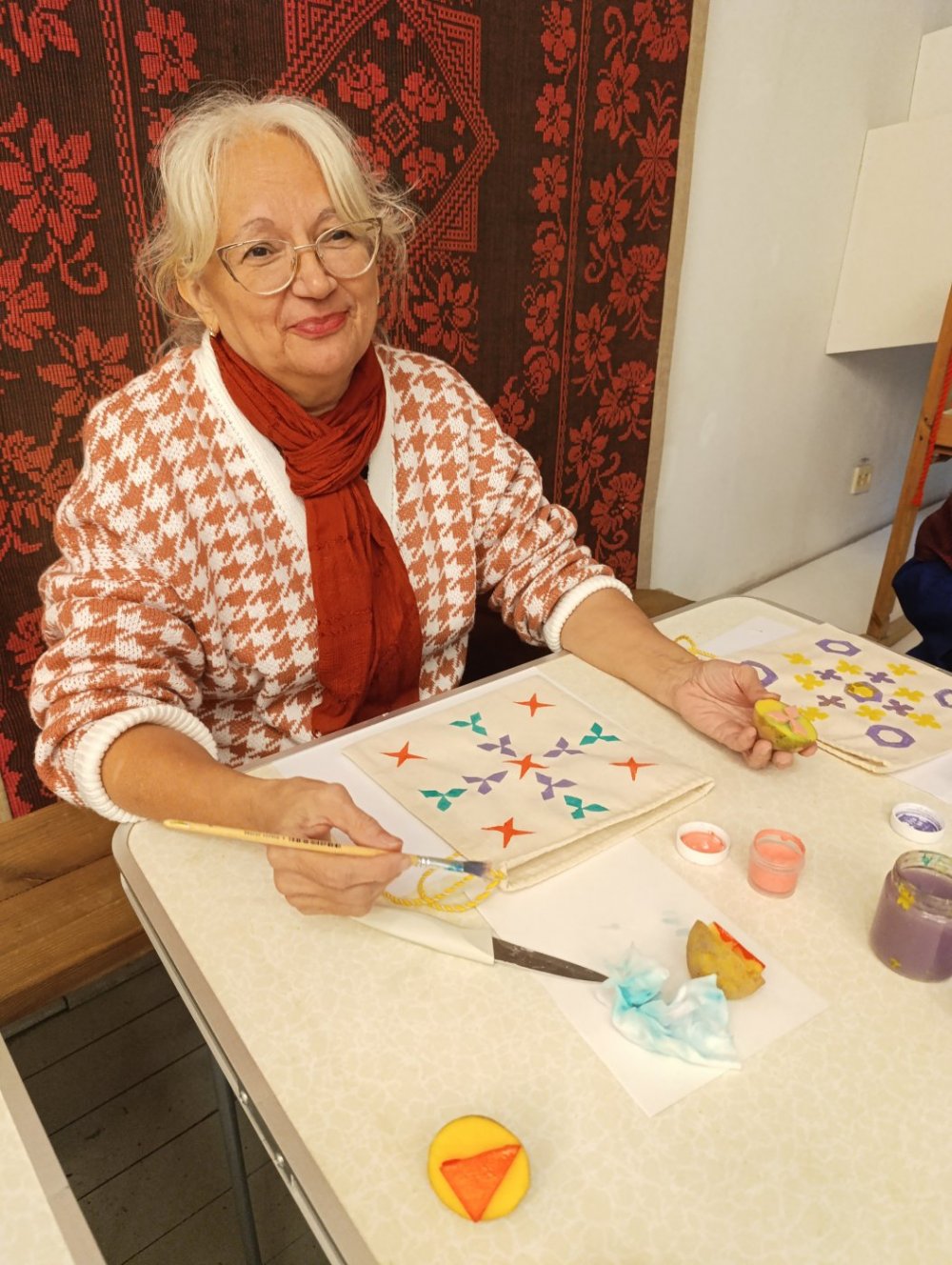 Сначала участники мастер-класса познакомились со старинной техникой декорирования ткани. Ремесло когда-то зародилось под ударами деревянного молотка с помощью досок-клише с рельефным орнаментом — набиванок. Под рукой тогда не всегда были нужные инструменты для работы. Люди проявляли смекалку! Для набойки часто использовали не только деревянные штампы, но и вырезанные из сырого картофеля, репы или моркови. Этот процесс ласково называли «цацкаванне». В Музее традиционного ручного ткачества Поозерья успешно возродили данную традицию! Мастер-класс был посвящён именно народному мастерству. Под руководством ведущего научного сотрудника музея Т. В. Бараненко участники мастер-класса с энтузиазмом принялись за создание собственных штампов из картофеля с простым геометрическим узором. Затем наступил самый интересный момент — декорирование ткани. Участники будто стали настоящими мастерами-набойщиками!